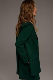 Трапециевидный жакет свободного покроя из текстильной ткани. Детали: пиджачный воротник, талиевые вытачки, функциональный нагрудный карман, прорезные карманы с клапанами, застежка на пуговицы, спинка со средним швом и высокой шлицей, рукава втачные двухшовные, жакет на подкладке Длина по спинке около 75 в размерах 40-46 и около 78 см в размерах 48-52, длина рукавов около 61 см