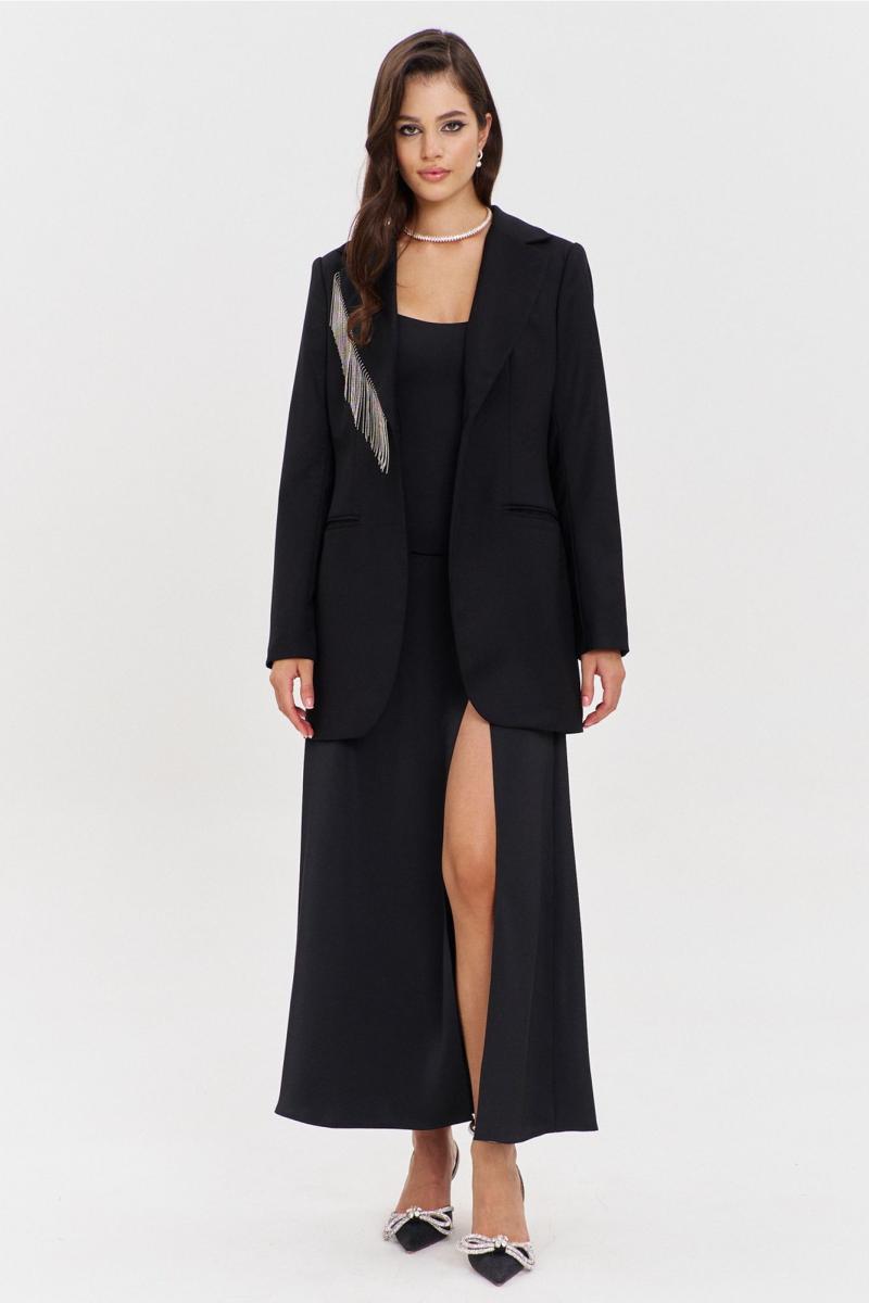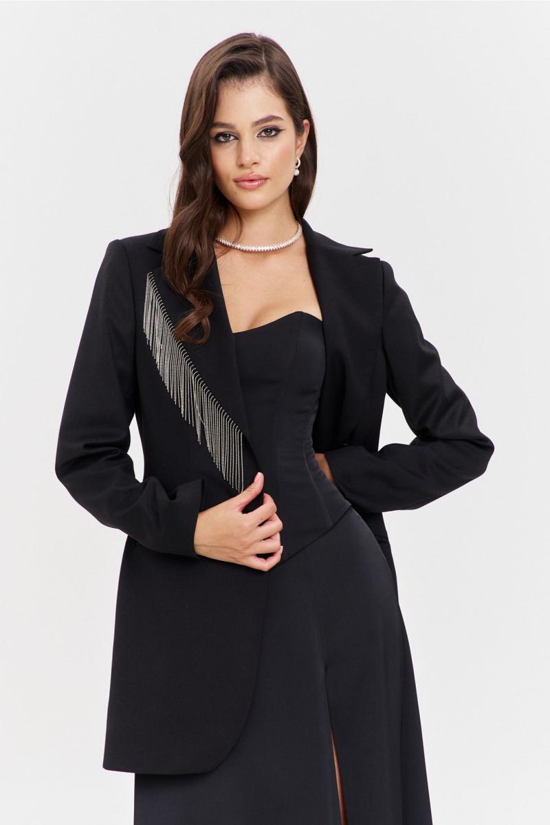 Жакет полуприлегающего силуэта, длиной ниже линии бедер. Спинка со средним швом, в котором обработана шлица, с рельефами от пройм до низа. Перед с нагрудной вытачкой, рельефом и прорезным карманом «в рамку». Рукава двушовные, втачные, длинные. Воротник пиджачного типа с лацканом. Правый лацкан декорирован отделочной тесьмой. Застежка на петлю и пуговицу. Жакет на подкладке.