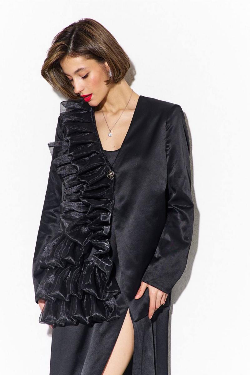 Жакет свободного кроя: -спинка с талиевыми вытачками -правый перед декорирован рюшами из отделочной ткани -горловина V-образной формы, без воротника -рукава двушовные, втачные, длинные -жакет на подкладке и с плечевыми накладками.