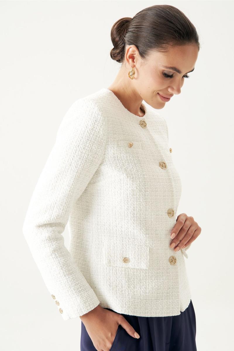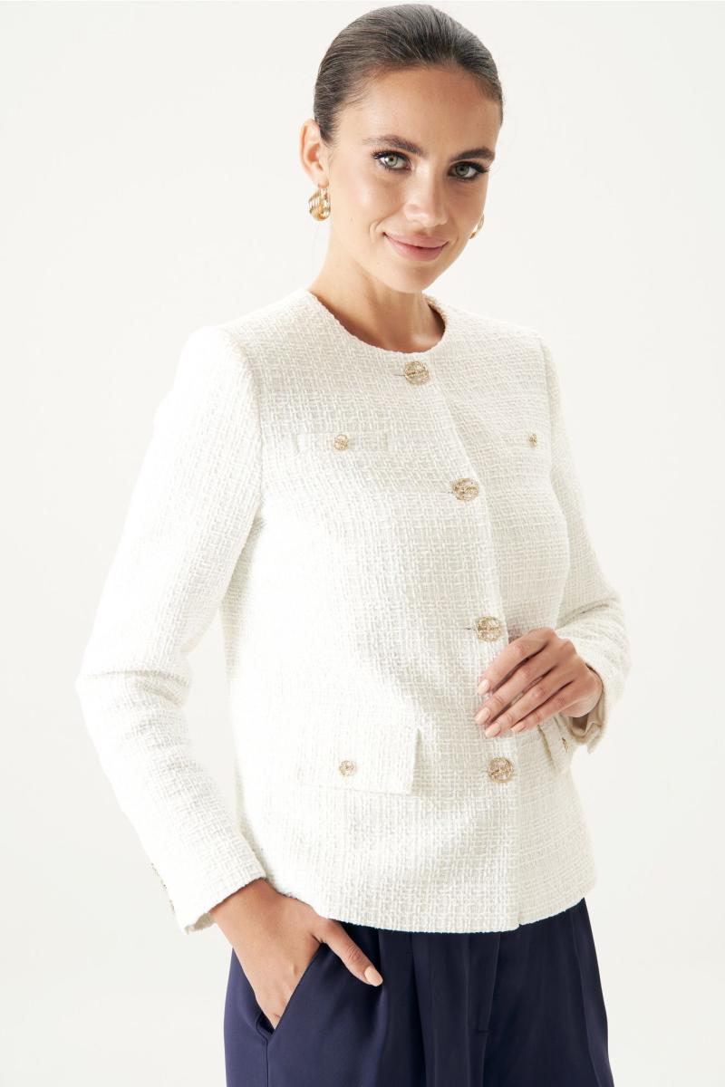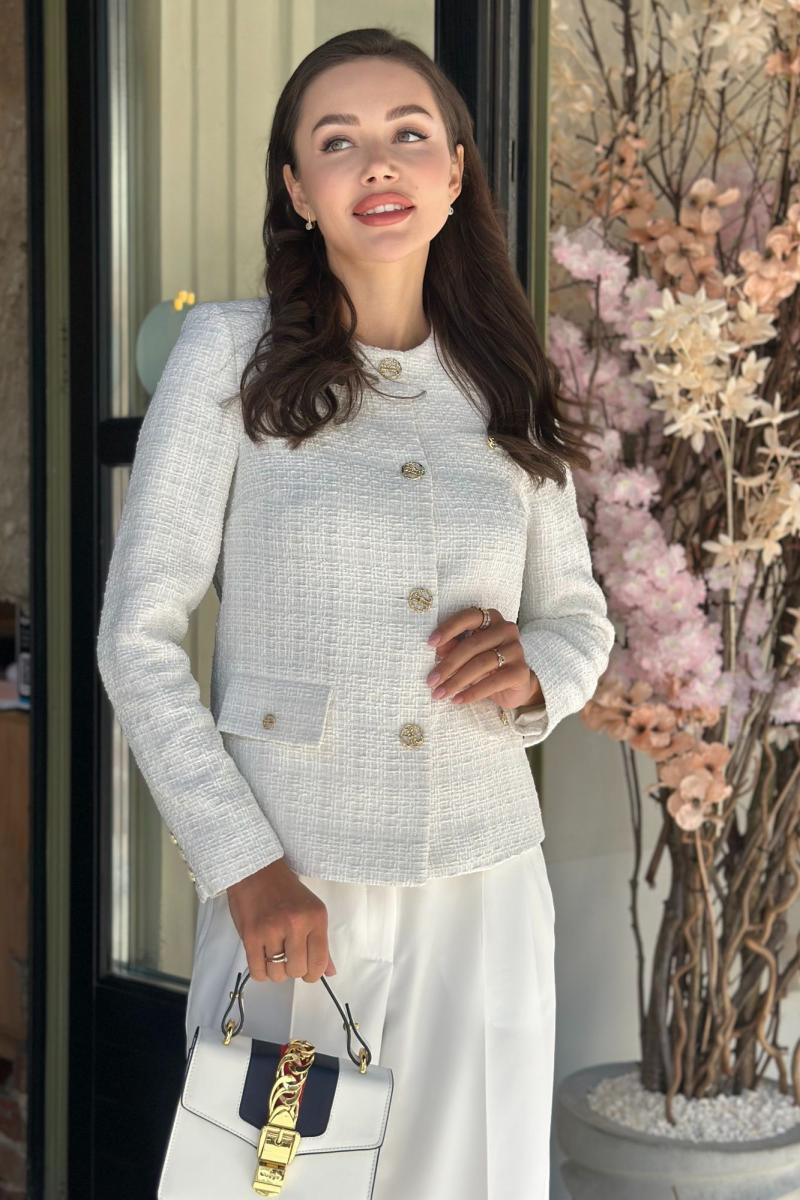 Белый твидовый жакет в стиле шанель – это воплощение элегантности и классики. Изготовленный из твида, он подчеркивает статус и изысканный вкус своего обладателя. Носите жакет в паре с любимыми джинсами, создавайте стильные образы с юбкой-карандаш или отдайте предпочтение маленькому черному платью – с чем бы вы его не сочетали, этот жакет станет вашим верным спутником на пути к успеху и гармонии. Жакет женский прямого силуэта, на подкладке. Жакет - нарядный.