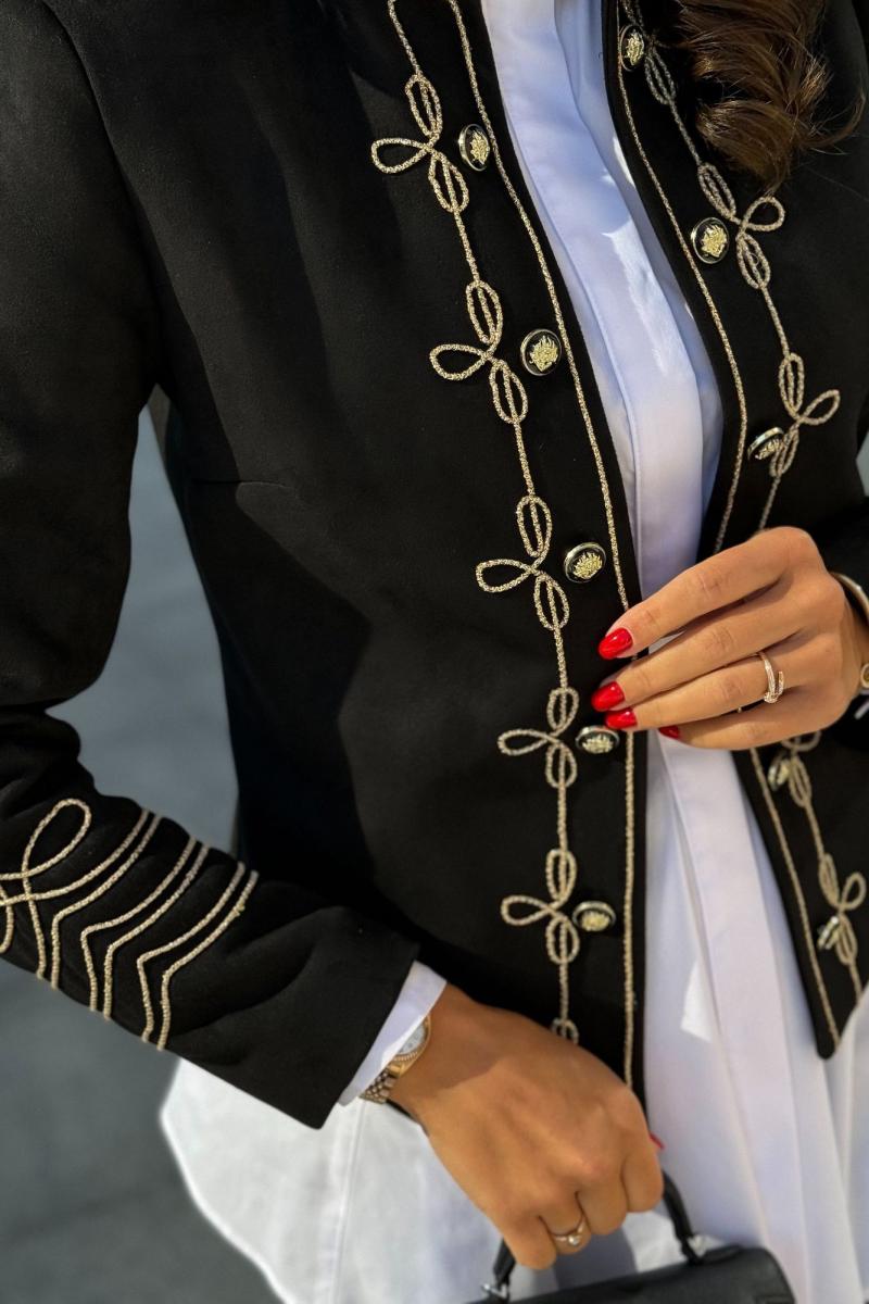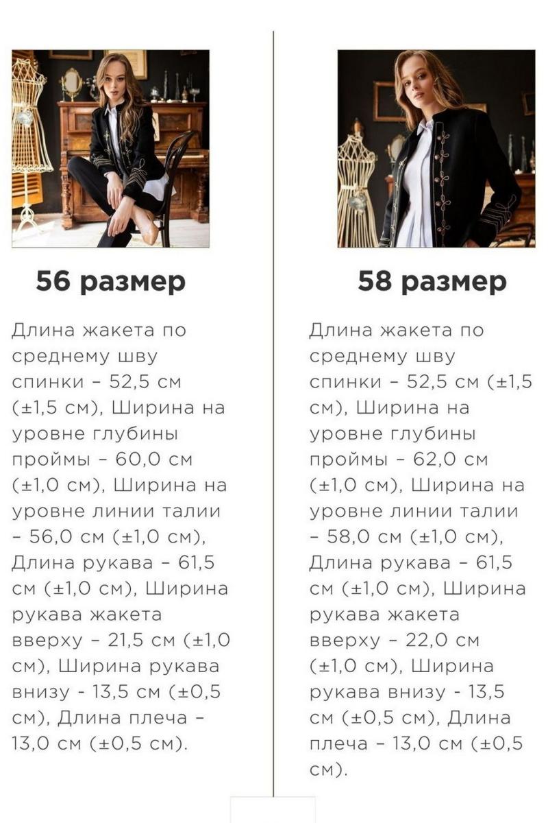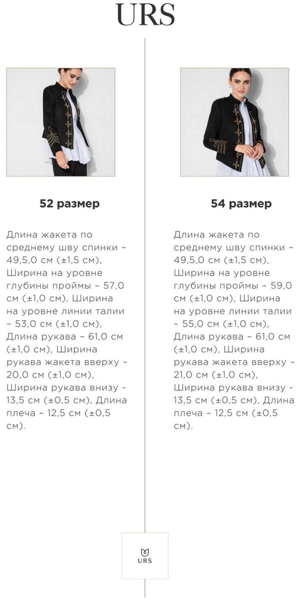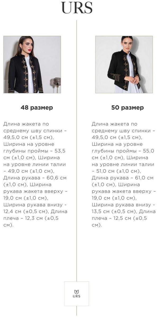 Замшевый жакет в стиле милитари с вышивкой - это оригинальный и стильный элемент гардероба, который подчеркнет вашу индивидуальность. Вышивка на жакете добавляет ему уникальности и делает его неповторимым. Этот жакет идеально сочетается с джинсами, брюками, платьями, создавая образ, который будет привлекать внимание окружающих. Жакет женский полуприлегающего силуэта из мягкой искусственной замши на трикотажной основе в гусарском стиле с декоративной вышивкой шнуром и шестью пуговицами, расположенными параллельно вышивке вдоль борта на левой и правой половинке, без застежки, на подкладке, с погонами, закрепленными пуговицей. Перед жакета разрезной, с нагрудными вытачками, выходящими из бокового шва. Спинка с рельефами, выходящими из проймы и средним швом. Линия низа асимметричная, спинка короче переда. По низу центральная часть переда выполнена углом. Рукава втачные двухшовные, длинные, с декоративной вышивкой шнуром в нижней части. Горловина обработана воротником-стойкой. Жакет с плечевыми накладками. Средняя длина жакета по среднему шву спинки - 50,0 см (±3,0 см), средняя длина рукава – 61,0 см (±1,5 см). Тип ткани: костюмно-плательная. Состав изделия: полиэстер - 75%, вискоза - 21%, спандекс - 4% "44:Длина жакета по среднему шву спинки – 49,5 см (±1,5 см), Ширина на уровне глубины проймы – 49,5 см (±1,0 см), Ширина на уровне линии талии – 45,0 см (±1,0 см), Длина рукава – 60,6 см (±1,0 см), Ширина рукава жакета вверху – 17,0 см (±1,0 см), Ширина рукава внизу - 12,4 см (±0,5 см), Длина плеча – 12,3 см (±0,5 см). 46:Длина жакета по среднему шву спинки – 49,5 см (±1,5 см), Ширина на уровне глубины проймы – 51,5 см (±1,0 см), Ширина на уровне линии талии – 47,0 см (±1,0 см), Длина рукава – 60,6 см (±1,0 см), Ширина рукава жакета вверху – 18,0 см (±1,0 см), Ширина рукава внизу - 12,4 см (±0,5 см), Длина плеча – 12,3 см (±0,5 см). 48:Длина жакета по среднему шву спинки – 49,5 см (±1,5 см), Ширина на уровне глубины проймы – 53,5 см (±1,0 см), Ширина на уровне линии талии – 49,0 см (±1,0 см), Длина рукава – 60,6 см (±1,0 см), Ширина рукава жакета вверху – 19,0 см (±1,0 см), Ширина рукава внизу - 12,4 см (±0,5 см), Длина плеча – 12,3 см (±0,5 см). 50:Длина жакета по среднему шву спинки – 49,5 см (±1,5 см), Ширина на уровне глубины проймы – 55,0 см (±1,0 см), Ширина на уровне линии талии – 51,0 см (±1,0 см), Длина рукава – 61,0 см (±1,0 см), Ширина рукава жакета вверху – 19,0 см (±1,0 см), Ширина рукава внизу - 13,5 см (±0,5 см), Длина плеча – 12,5 см (±0,5 см). 52:Длина жакета по среднему шву спинки – 49,5 см (±1,5 см), Ширина на уровне глубины проймы – 57,0 см (±1,0 см), Ширина на уровне линии талии – 53,0 см (±1,0 см), Длина рукава – 61,0 см (±1,0 см), Ширина рукава жакета вверху – 20,0 см (±1,0 см), Ширина рукава внизу - 13,5 см (±0,5 см), Длина плеча – 12,5 см (±0,5 см). 54:Длина жакета по среднему шву спинки – 49,5 см (±1,5 см), Ширина на уровне глубины проймы – 59,0 см (±1,0 см), Ширина на уровне линии талии – 55,0 см (±1,0 см), Длина рукава – 61,0 см (±1,0 см), Ширина рукава жакета вверху – 21,0 см (±1,0 см), Ширина рукава внизу - 13,5 см (±0,5 см), Длина плеча – 12,5 см (±0,5 см). 56:Длина жакета по среднему шву спинки – 52,5 см (±1,5 см), Ширина на уровне глубины проймы – 60,0 см (±1,0 см), Ширина на уровне линии талии – 56,0 см (±1,0 см), Длина рукава – 61,5 см (±1,0 см), Ширина рукава жакета вверху – 21,5 см (±1,0 см), Ширина рукава внизу - 13,5 см (±0,5 см), Длина плеча – 13,0 см (±0,5 см). 58:Длина жакета по среднему шву спинки – 52,5 см (±1,5 см), Ширина на уровне глубины проймы – 62,0 см (±1,0 см), Ширина на уровне линии