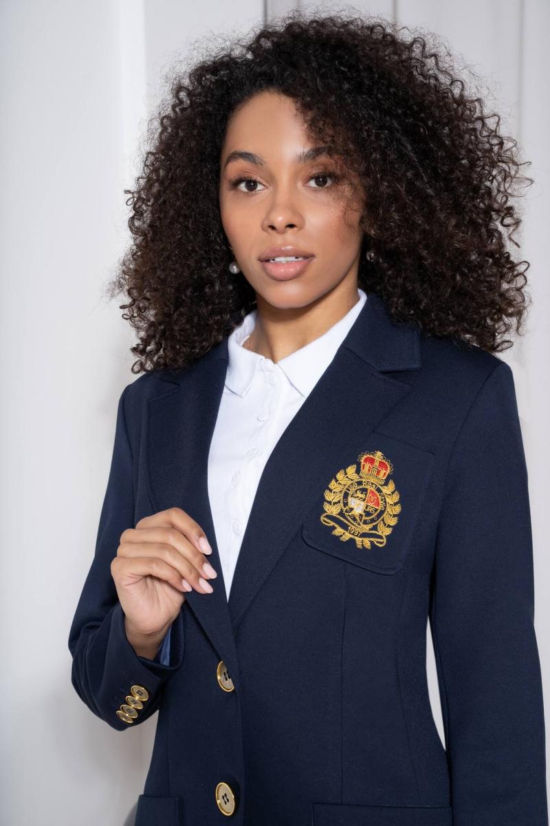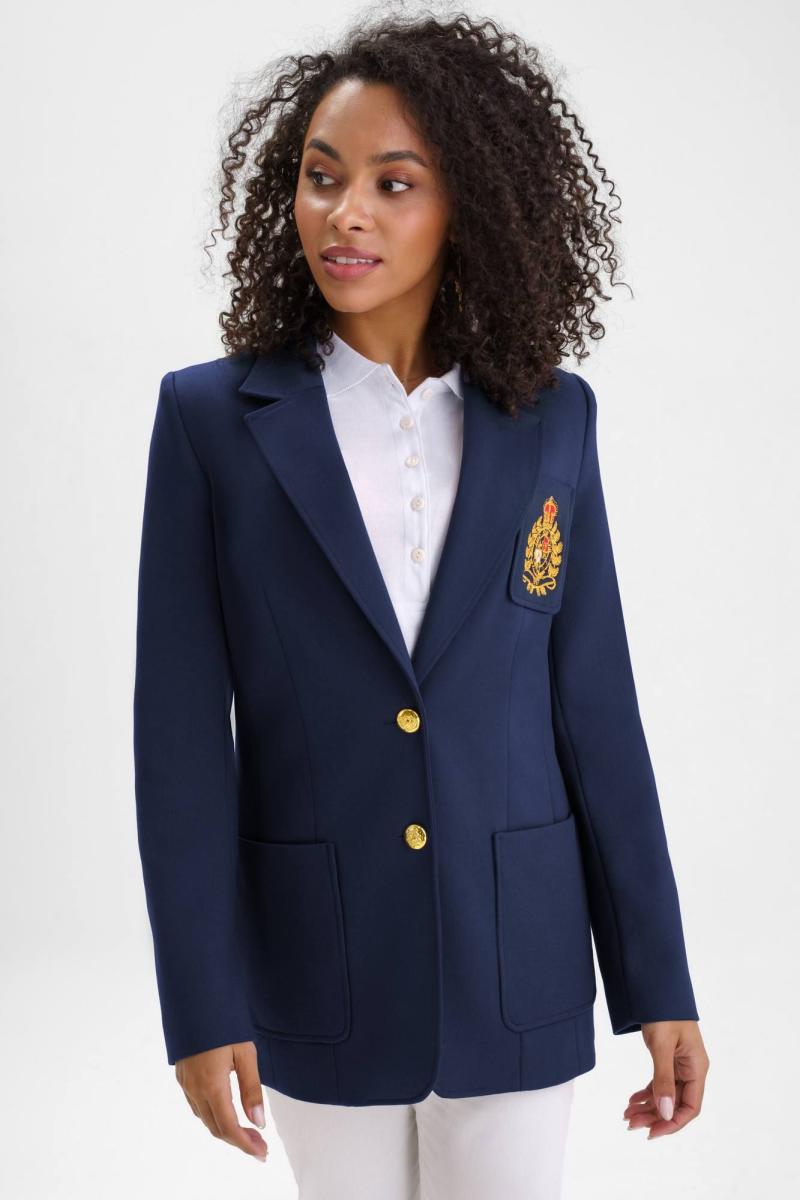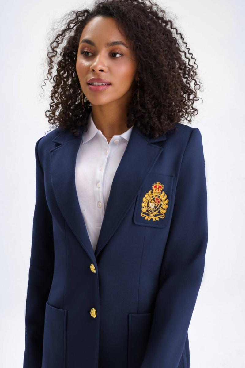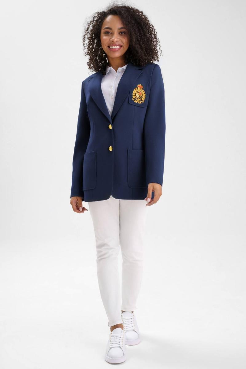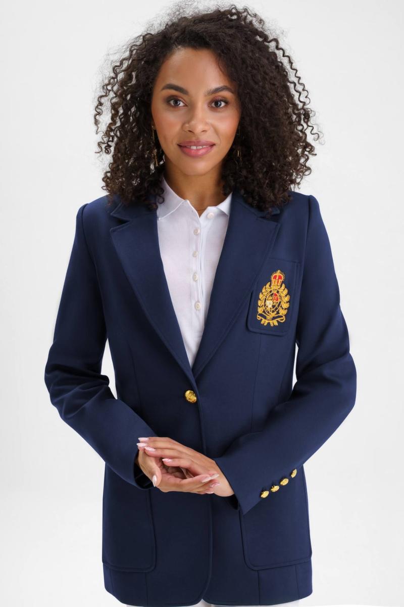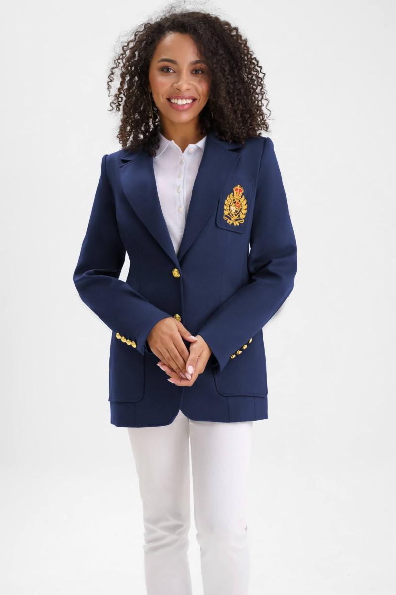 Жакет женский полуприлегающего силуэта с центральной бортовой застежкой на 2 петли и пуговицы, на подкладке. В нижней части переда настрочены 2 накладных карман, ширина шва настрачивания кармана - 0,5 см. На левой половинке переда настрочен нагрудный карман с эксклюзивной вышивкой, ширина шва настрачивания кармана - 0,5 см. Углы карман - скругленные. Спинка с рельефными швами, выходящими из проймы до низа и средним швом завершающийся шлицей. Горловина обработана отложным воротником пиджачного типа. По краю воротника, лацканам и борту проложена отделочная строчка на 0,5 см от края. Линия борта внизу закругленная. Рукава втачные двухшовные, длинные. В нижней части локтевого шва обработана отлетная закрытая шлица, застегивается на 4 петли и пуговицы. Плечевой пояс жакета оформлен плечевыми накладками.