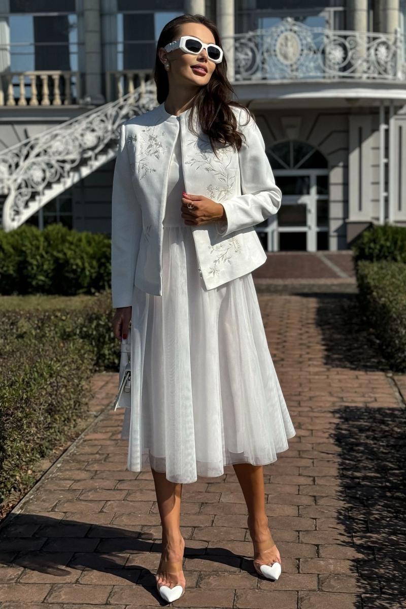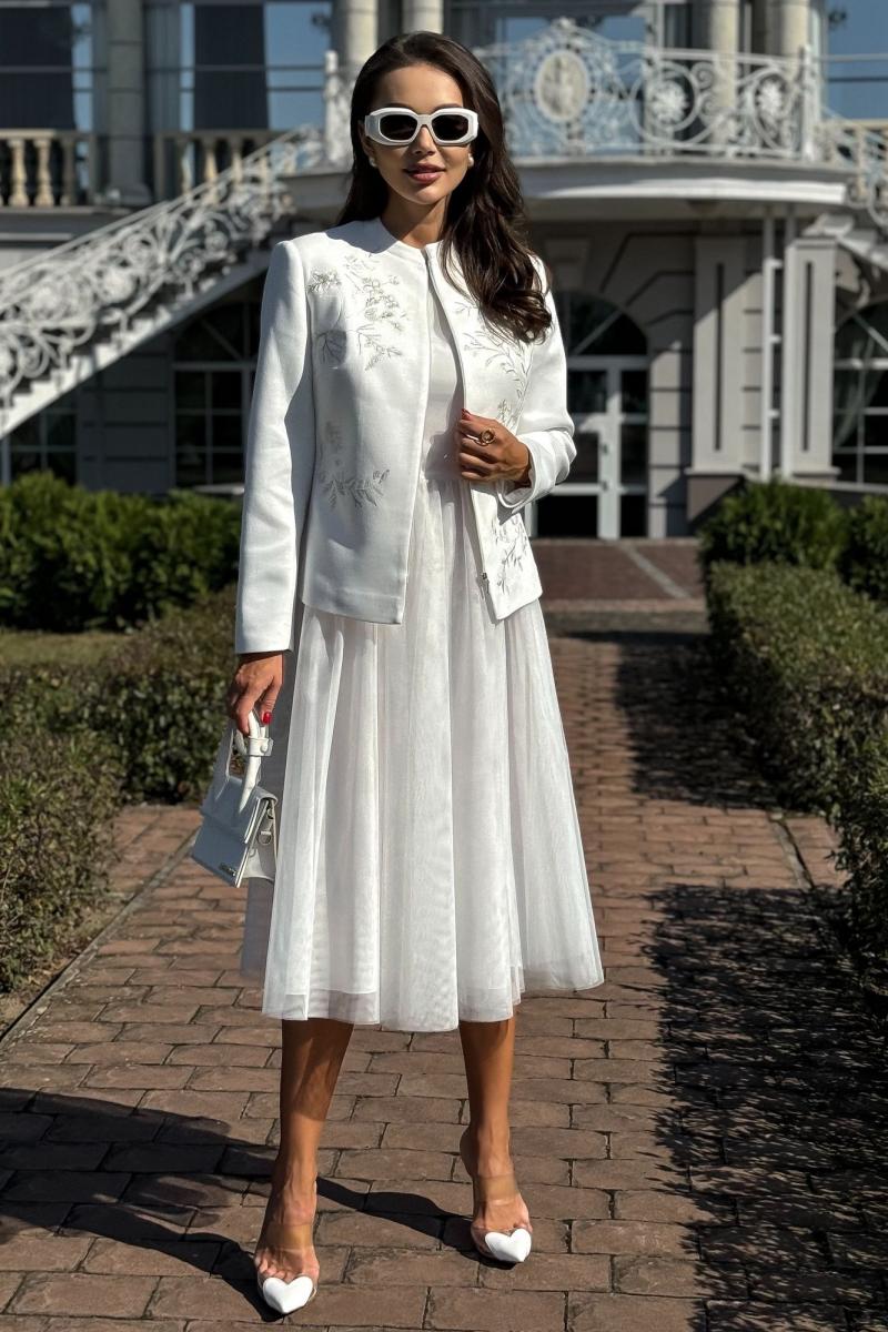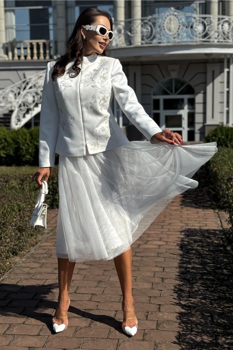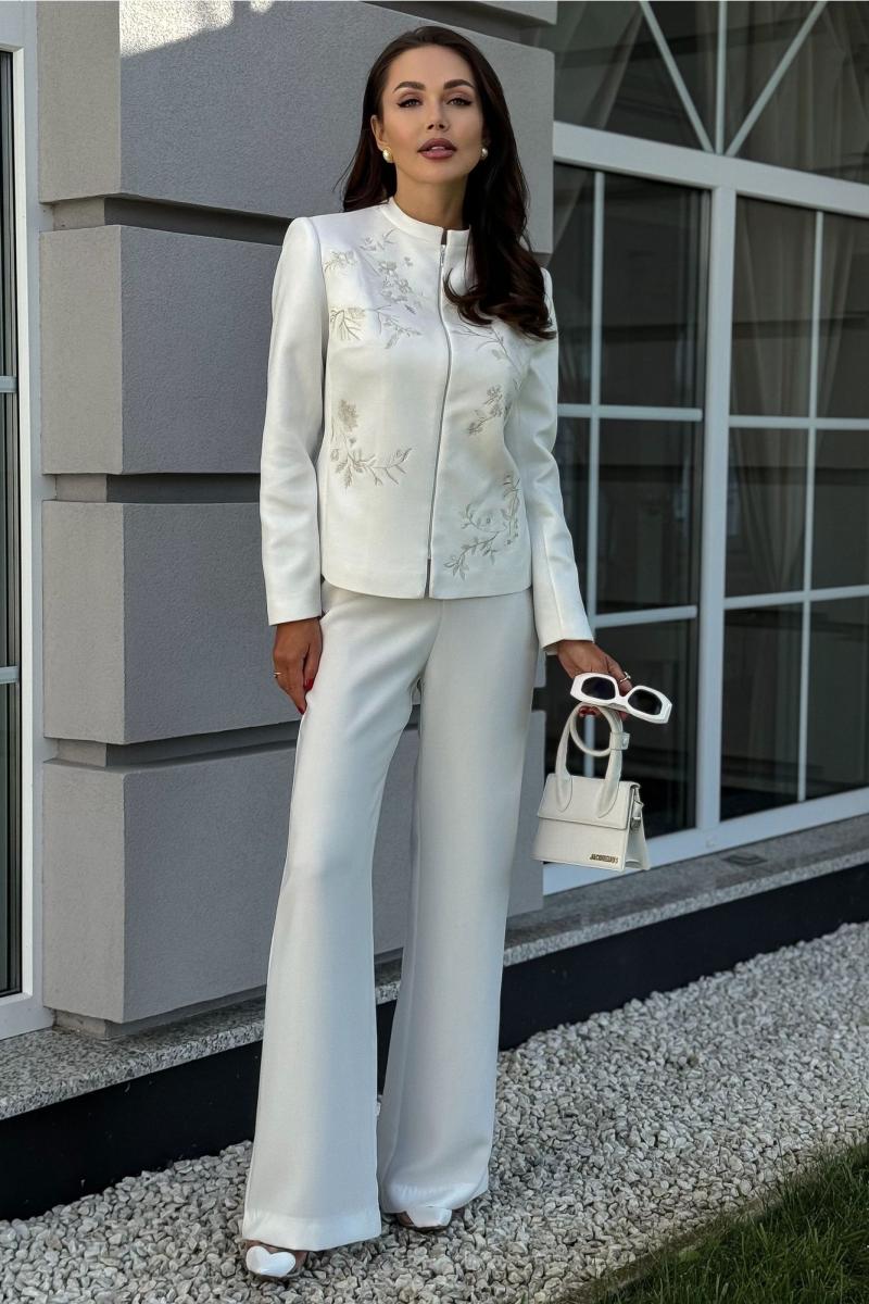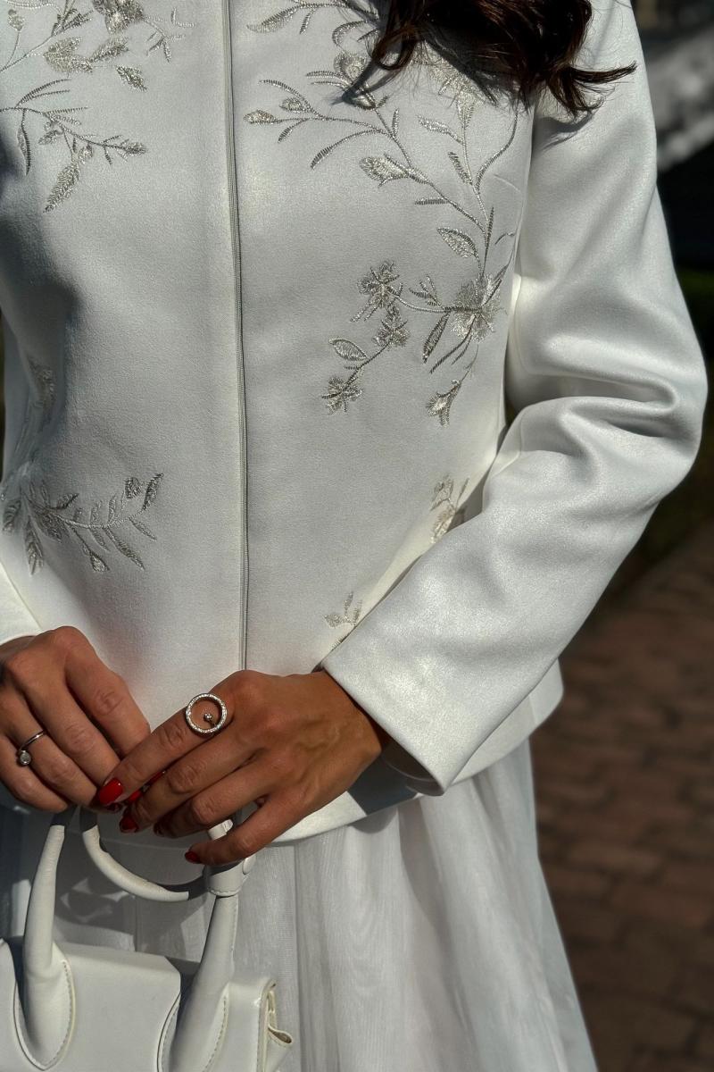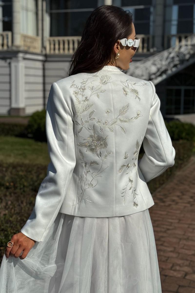 Жакет женский нарядный, полуприлегающего силуэта, выполнен из мягкой искусственной замши на трикотажной основе, с центральной бортовой застежкой ""встык"" с разъемной потайной молнией. Молния расположена на расстоянии 5,0 см от низа и заканчивается у воротника-стойки. Жакет на подкладке. Перед и спинка оформлены художественной вышивкой.