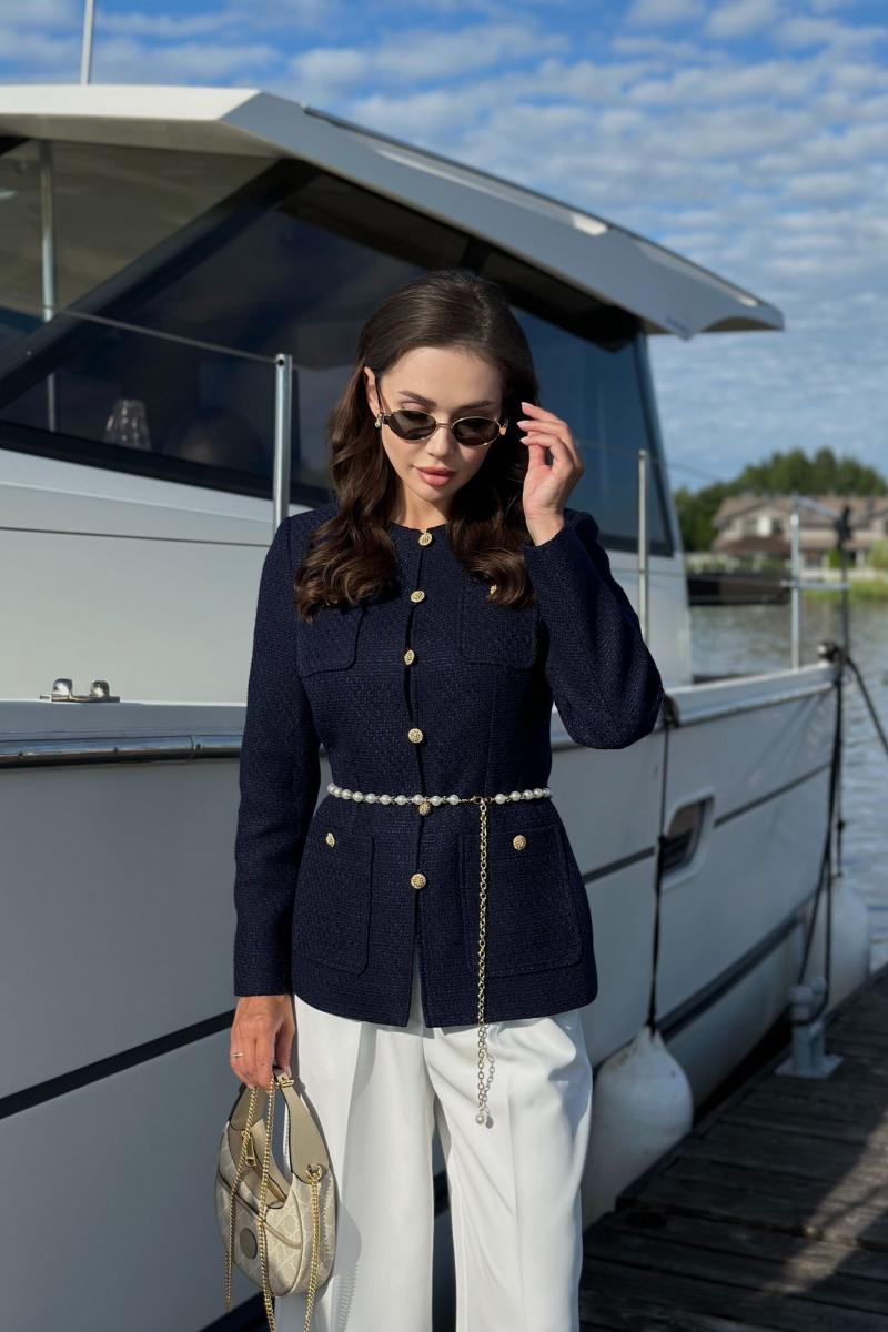 Элегантный твидовый жакет с дизайнерским поясом — это воплощение изысканности и стиля. Дизайнерский пояс, выполненный из декоративного жемчуга, придаёт жакету особую изюминку и делает его ещё более стильным, подчёркивая женственность и создавая акцент на линии талии.