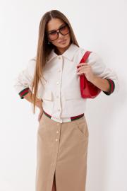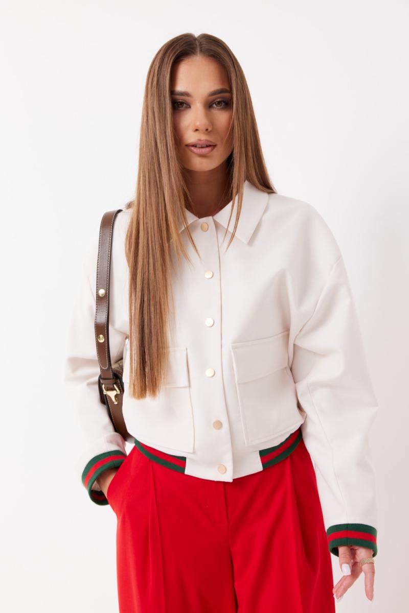 Жакет укороченный из костюмной ткани. Застёжка по переду на кнопки. По переду накладные карманы с клапаном. Воротник отложной. Рукав прямой на трикотажной манжете. Низ жакета на трикотажном поясе. Жакет на подкладке.